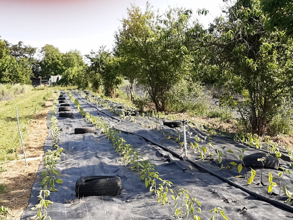 Aber auch für die Pflanzen ist der Schatten sehr willkommen. Der Anbau in dieser Region wird wegen der Hitze und des fehlenden Wassers immer schwieriger. Einige Kulturen, vor allem Kohl, können in der Region gar nicht mehr gepflanzt werden. Ludovic hat eine interessante Methode erfunden: der Boden wird dick mit Stroh bedeckt und stark gewässert. Darüber kommt eine Plastikplane. In diese werden Löcher geschnitten und darin wird gepflanzt. Nach der Pflanzung wird die Fläche ca. 6 – 7 Stunden gesprengt. Das Stroh, die Plane und der Schatten der Bäume führen dazu, dass Ludovic einige Kulturen für den Rest der Anbauzeit kaum noch wässern muss. Das zeigt sehr anschaulich, wie gut das Mikroklima ist, dass Bäume um sich herum kreiern können.