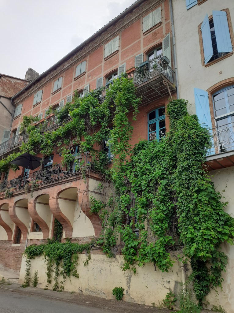 Glyzinie und wilder Wein an einer Hauswand hochrankend. Glyzinie, auch Blauregen genannt, ist eine robuste, schnell wachsende Rankpflanze, die blühend tatsächlich einen blauen Regen herabhängen lässt.