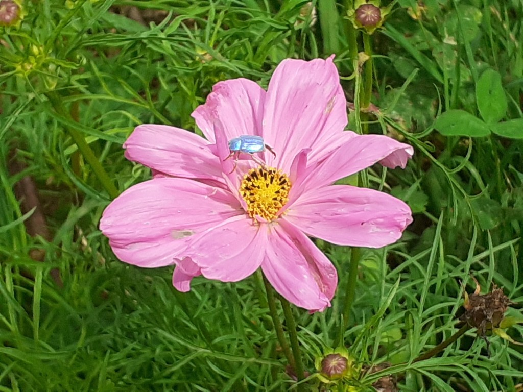 Kosmee, die einen farblich abgestimmten Käfer, den Blauen Bartläufer, angelockt hat.